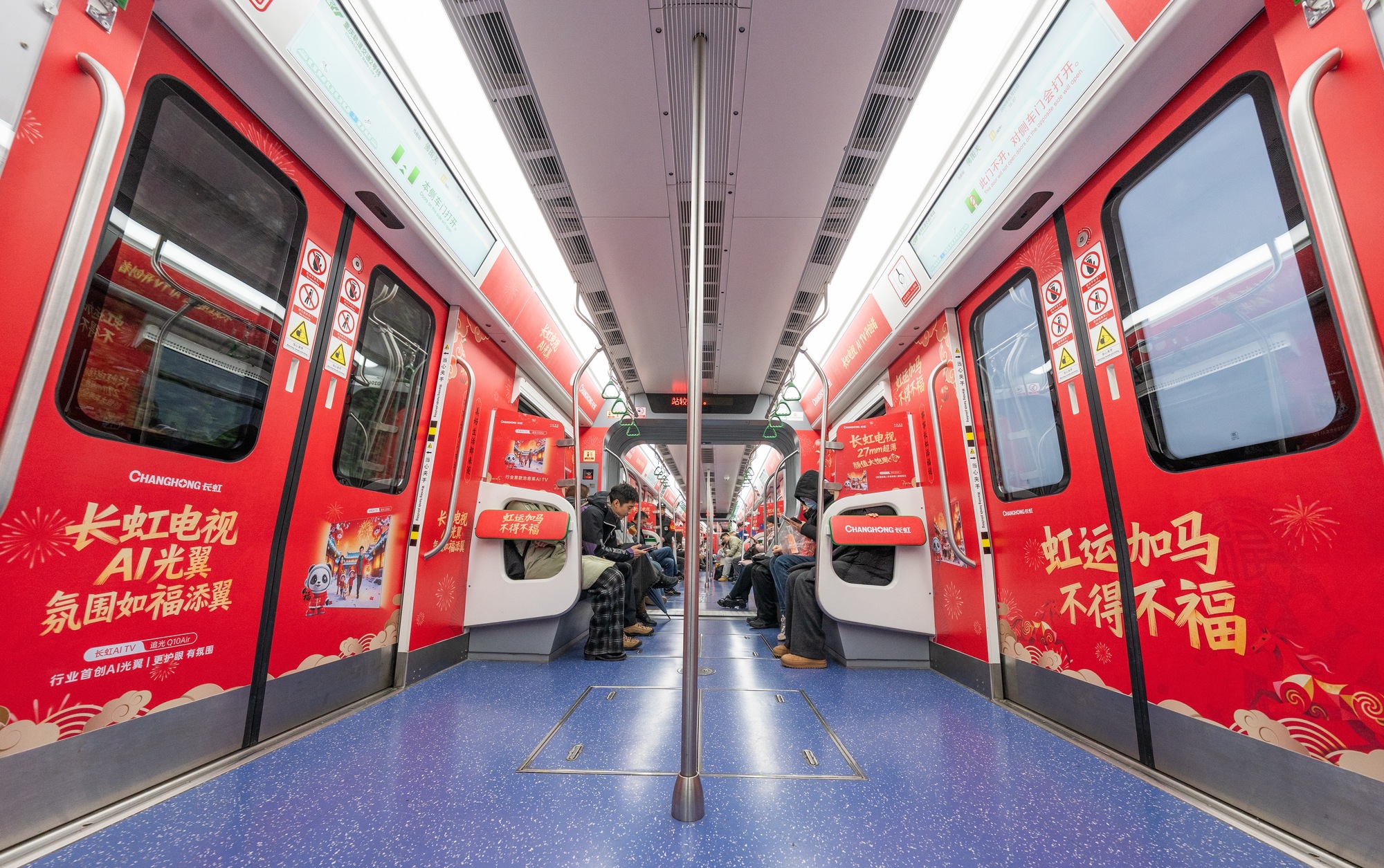 1月22日上午,乘客搭乘重庆地铁时进入2号线车厢时,扑面而来的“过年”氛围感让人暖意十足——红底金字的车厢涂装和“虹运加马 不得不福”等喜庆标语,让通勤地铁秒变“新春客厅”。