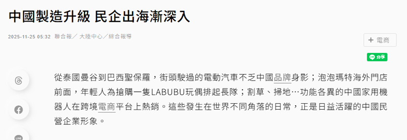 联合新闻网近日发文称,从泰国曼谷到巴西圣保罗,街头驶过的电动汽车不乏中国品牌身影;泡泡玛特海外门店前面,年轻人为抢购一只LABUBU玩偶排起长队;割草、扫地…功能各异的中国家用机器人在跨境电商平台上热销。这些发生在世界不同角落的日常,正是日益活跃的中国民营企业形象。