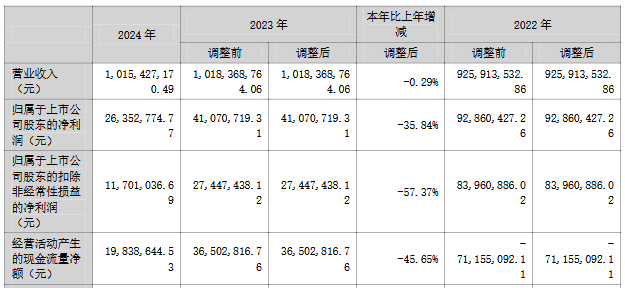 此外,2021年至2024年,公司营业收入分别为10.63亿元、9.26亿元、10.18亿元、10.15亿元,归属于上市公司股东的净利润分别为1.33亿元、9,286.04万元、4,107.07万元、2,635.28万元,归属于上市公司股东的扣除非经常性损益的净利润分别为1.15亿元、8,396.09万元、2,744.74万元、1,170.10万元,经营活动产生的现金流量净额分别为-7,683.63万元、-7,115.51万元、3,650.28万元、1,983.86万元。
