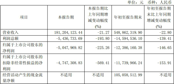 今年前三季度,合富中国实现营业收入5.49亿元,同比减少22.80%;归属于上市公司股东的净利润-1238.62万元,同比减少146.65%;归属于上市公司股东的扣除非经常性损益的净利润-1174.00万元,同比减少153.91%;经营活动产生的现金流量净额1.05亿元。