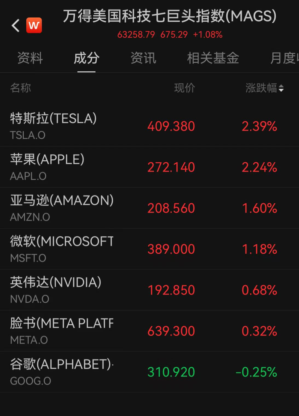大型科技股多数上涨,万得美国科技七巨头指数上涨1.08%,特斯拉上涨2.39%,苹果上涨2.24%,亚马逊上涨1.60%,微软上涨1.18%,英伟达上涨0.68%,META上涨0.32%,谷歌-C下跌0.25%。
