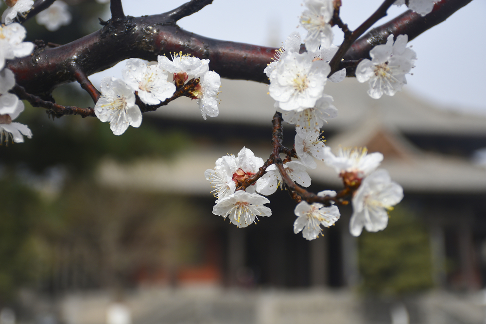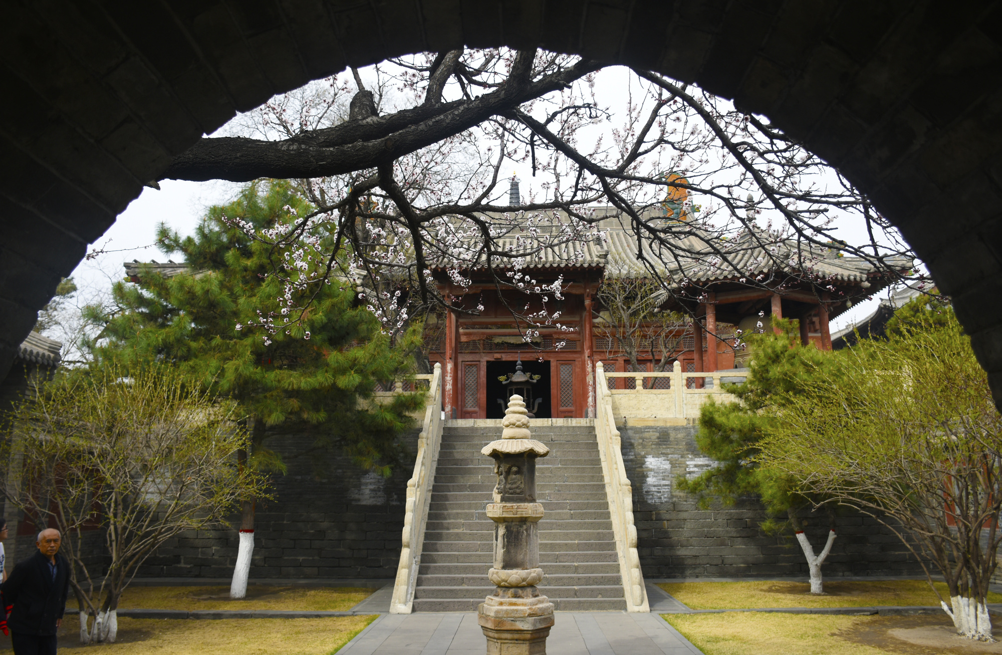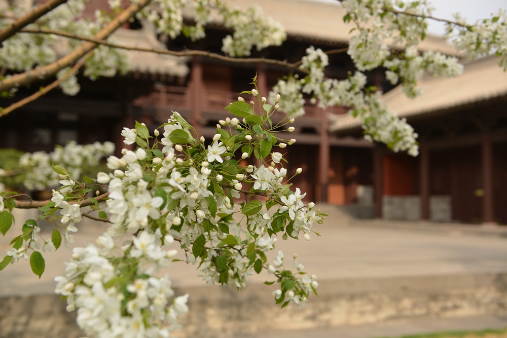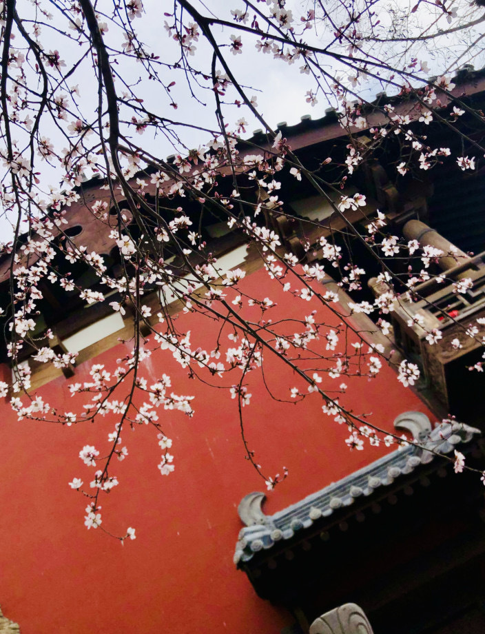 在这里拍照也很有讲究。用广角镜头拍摄古寺全景,将繁花、殿宇与蓝天都收纳进画面,把画面中心聚焦于袅袅香烟,采用对称构图的方式,能够充分展现古寺的庄重,让春日的华严寺尽显宁静深邃之美。