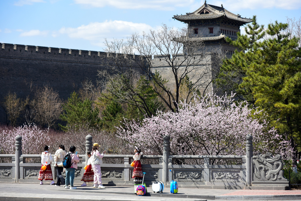 摄影爱好者赵文贵推荐:“下午3点至5点是这里拍摄的黄金时段,逆光拍摄能拍出花瓣的透明感。沿着城墙根赏杏花,感受春意,等待夕阳下,登上城墙俯瞰花海。华灯初上时,古今交融的夜景超震撼。如果想一站式领略大同春日的多样风情,古风爱好者可以穿浅色汉服,搭配城墙青砖,建议从南城墙入口开始,沿带状公园步行至护城河,河面倒影与花瓣飘落能拍出天女散花的效果。”