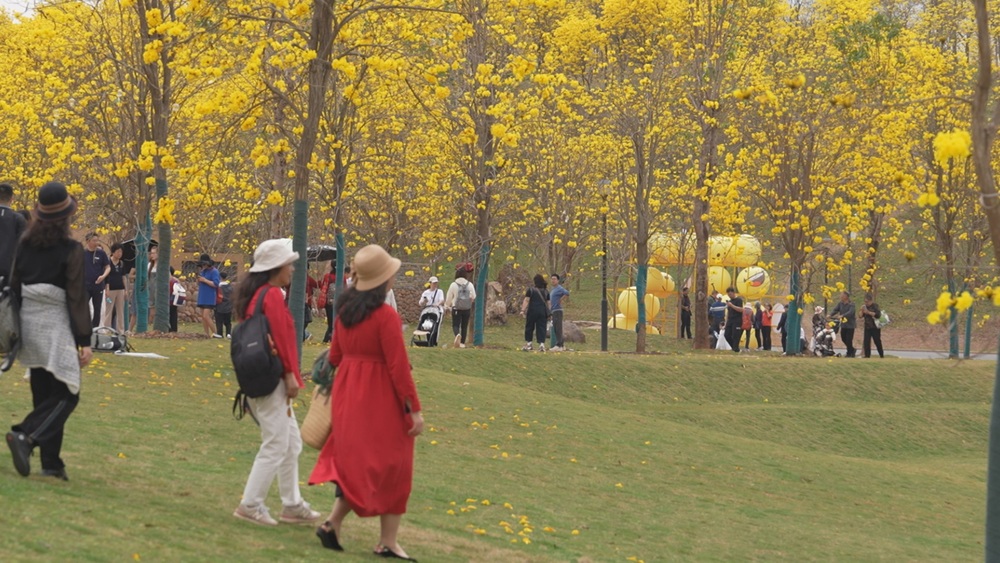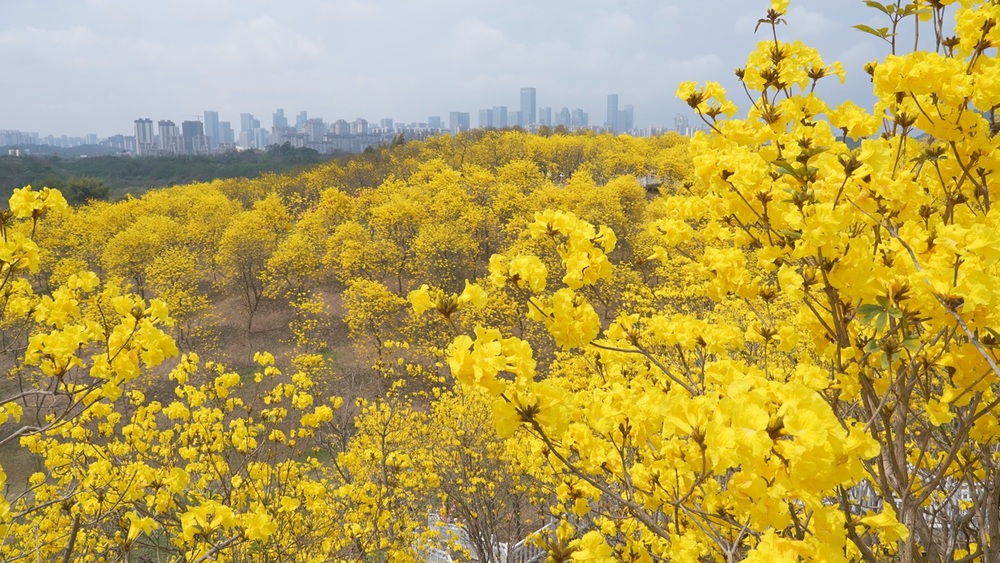 头顶是摇响春天的黄花风铃,脚下是飘落花瓣织就的金毯。三月,北方尚未褪去冬意,这里的上万株乔木已悄然绽放。开花时几乎不见绿叶,金灿灿的花瓣形似风铃,簇拥成团,满眼都是“满树繁花不见叶”的景象。