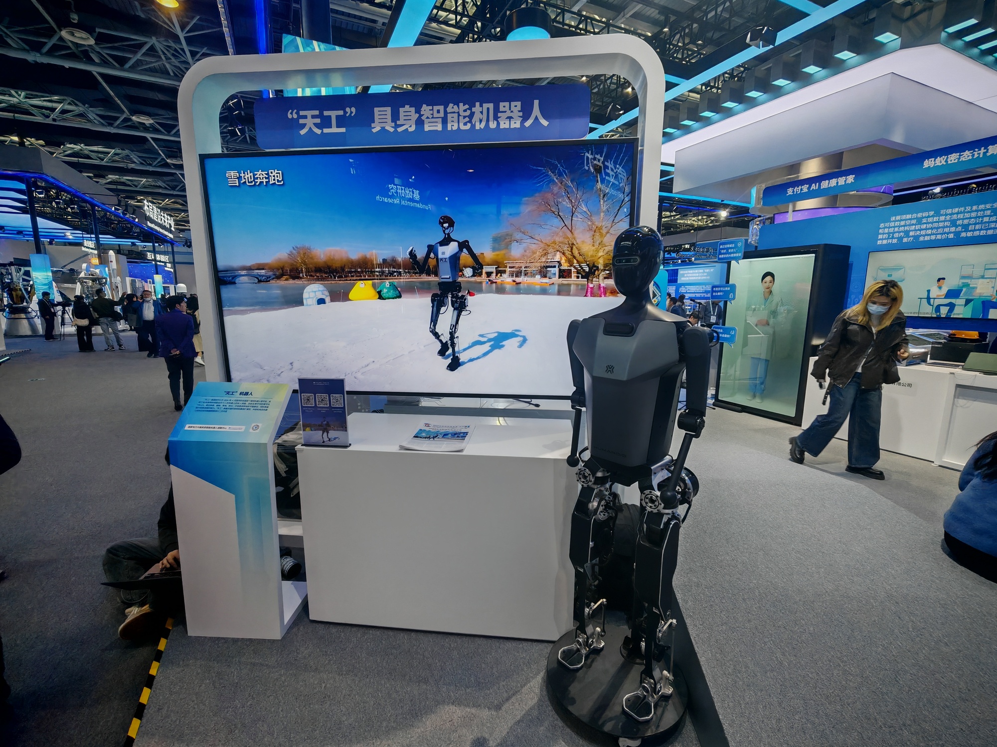 在人形机器人展区,一款名为“天工”的机器人迈着稳健的步伐绕场行走,向过往嘉宾打招呼,热情的互动引来众多现场嘉宾驻足围观。北京人形机器人创新中心有限公司工作人员李怡彭告诉记者,除了在台上跨越复杂地形的“天工lite”,创新中心还带来了尚未发布的“天工2.0”机器人,在中关村论坛首次对外亮相。此外,“天工”还内置了一个聪明大脑——“慧思开物”,让机器人可以实时调整全身动作与步态,自如应对各种未知和复杂的地形环境,拥有强大的运动控制能力,目前已经在电力巡检等场景中进行实训。