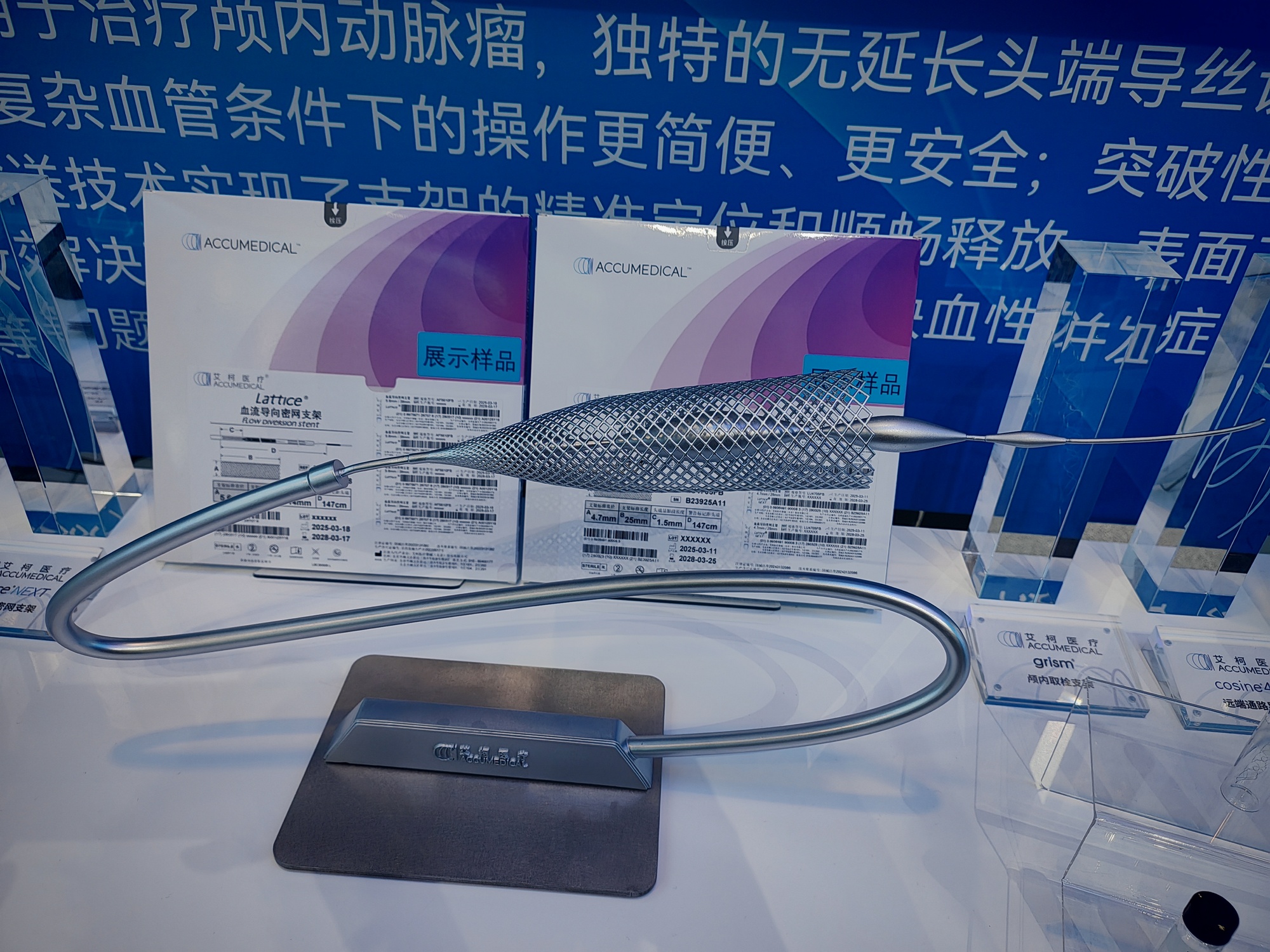 在高端医疗器械展区,一个螺旋式的模型吸引了记者注意。现场工作人员告诉记者,这是一个血流导向密网支架的模型,这个支架可以通过密网支架植入手术,不用开颅就能治疗出血性脑卒中等疾病,为患者减少手术伤害。艾柯医疗公共事务经理王继斌介绍,这项技术已经大量用于临床手术。