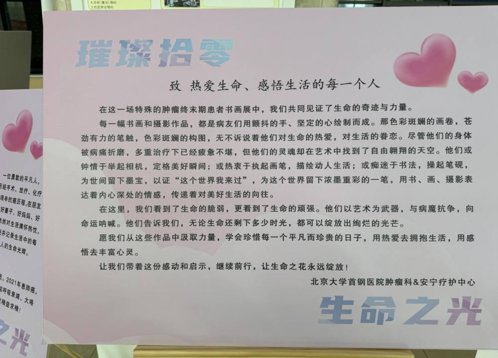 这天,安宁疗护病房举办了一场特殊的“艺术展”。患者们把自己对生命的感悟,用书法、绘画和摄影作品的形式在医院门诊大厅展出——这既是向公众展示他们的才华和勇气,也是提醒普通人:珍惜健康、好好生活。