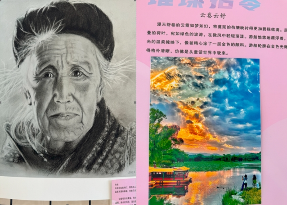 病友的素描作品《我的母亲》和唐伟的摄影作品《云卷云舒》