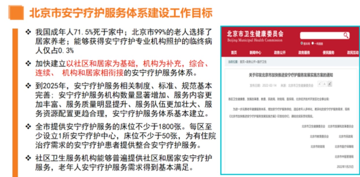 2017年,当时的国家卫计委发布的《安宁疗护实践指南(试行)》中指出:疾病终末期,有安宁疗护需求的患者,可以接受这项服务。同年,北京大学首钢医院设立了北京第一家“安宁疗护病房”。