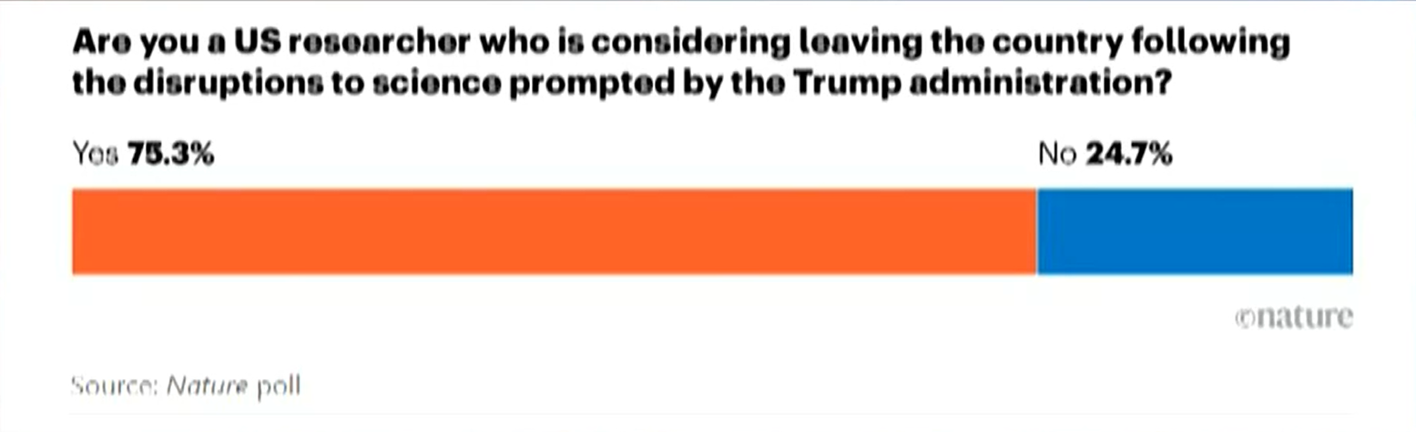 今年3月,《自然》杂志对1200多名美国机构研究人员进行的一项民意调查发现,其中75%表示正在考虑离开美国。