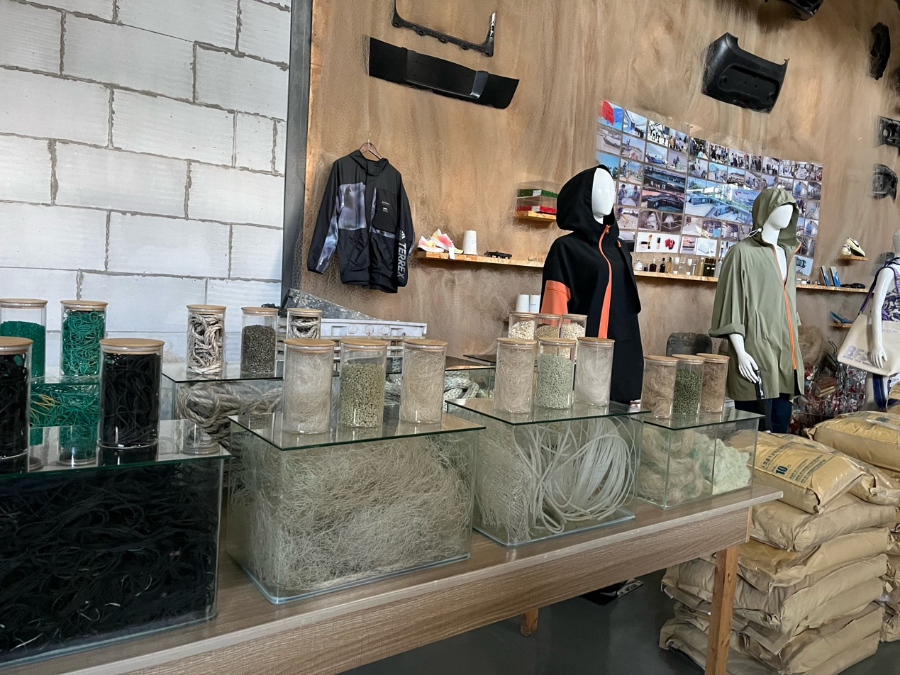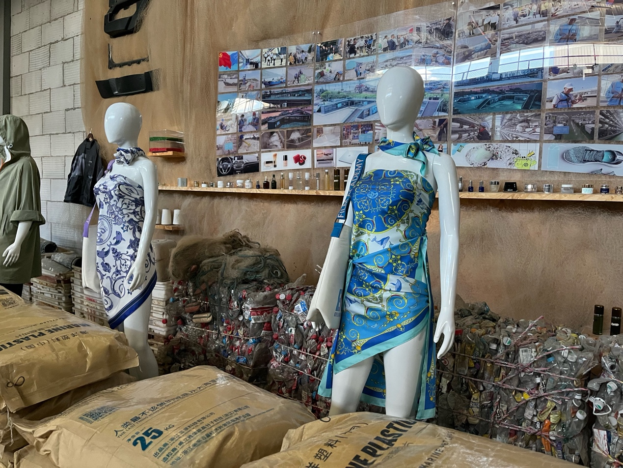 一条颜色鲜艳的丝巾,前身是5个漂在海里的塑料瓶;一个结实耐用的背包,制作时用了22个塑料瓶……除了这些衣服、背包,还有用再生海洋塑料制成的收纳盒、装饰摆件、户外用品等。