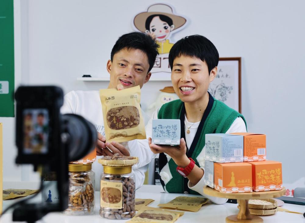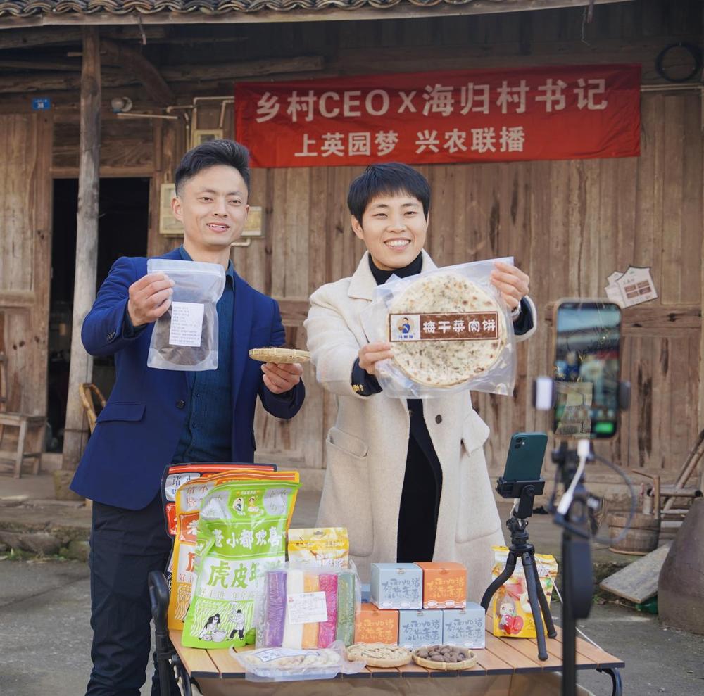庄园(右一)在网上直播销售上英村“土特产”