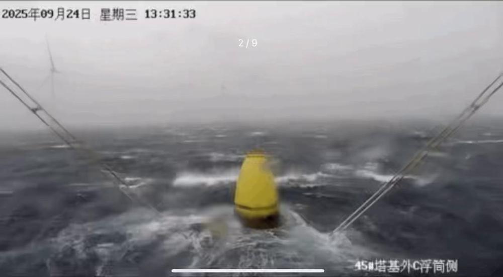 “明阳天成号”还安装了智能感应器,可以通过视频、图像、音频等多传感器数据融合技术,实时感知2000多个零部件运行状态。通过实时监控画面可以看到,在13级风力、每秒40米风速的台风和海浪冲击下,犹如海上庞然大物的 “明阳天成号”只是随风轻轻摇摆,无论巨大的黄色浮桶还是“Y”字形的塔架都很牢固。