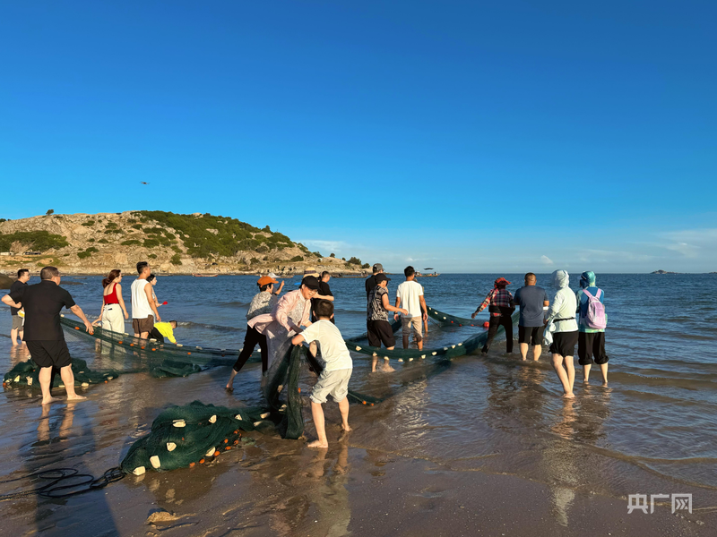 “一、二、三,加油!小朋友,巴浪鱼来了,加油!”在南日岛浮叶村燕里湾沙滩旁,几十名游客拉住长长的渔网,奋力向岸上拖拽。一会儿工夫,渔网就被收了上来,大家赶紧凑过去,看看到底有什么收获。