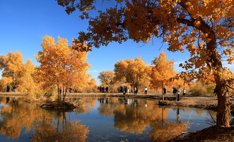 兰州游客杨明说:“我来到了胡杨林,站在观景台上放眼望去,金色的胡杨,碧蓝的湖水,洁白的沙丘,构成了一幅美丽的画卷。秋天这里简直就是美丽的童话世界。”