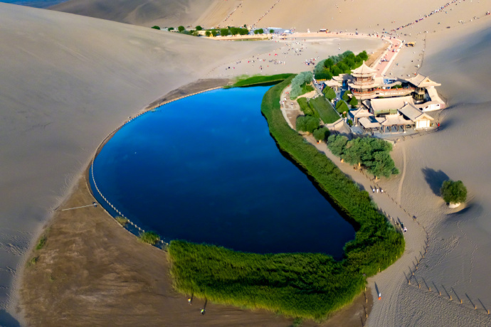 浙江游客肖丹说:“月牙泉非常美,鸣沙山的沙非常细腻,环境很清凉,看到无边无际的沙海,心情都变得很舒畅。”