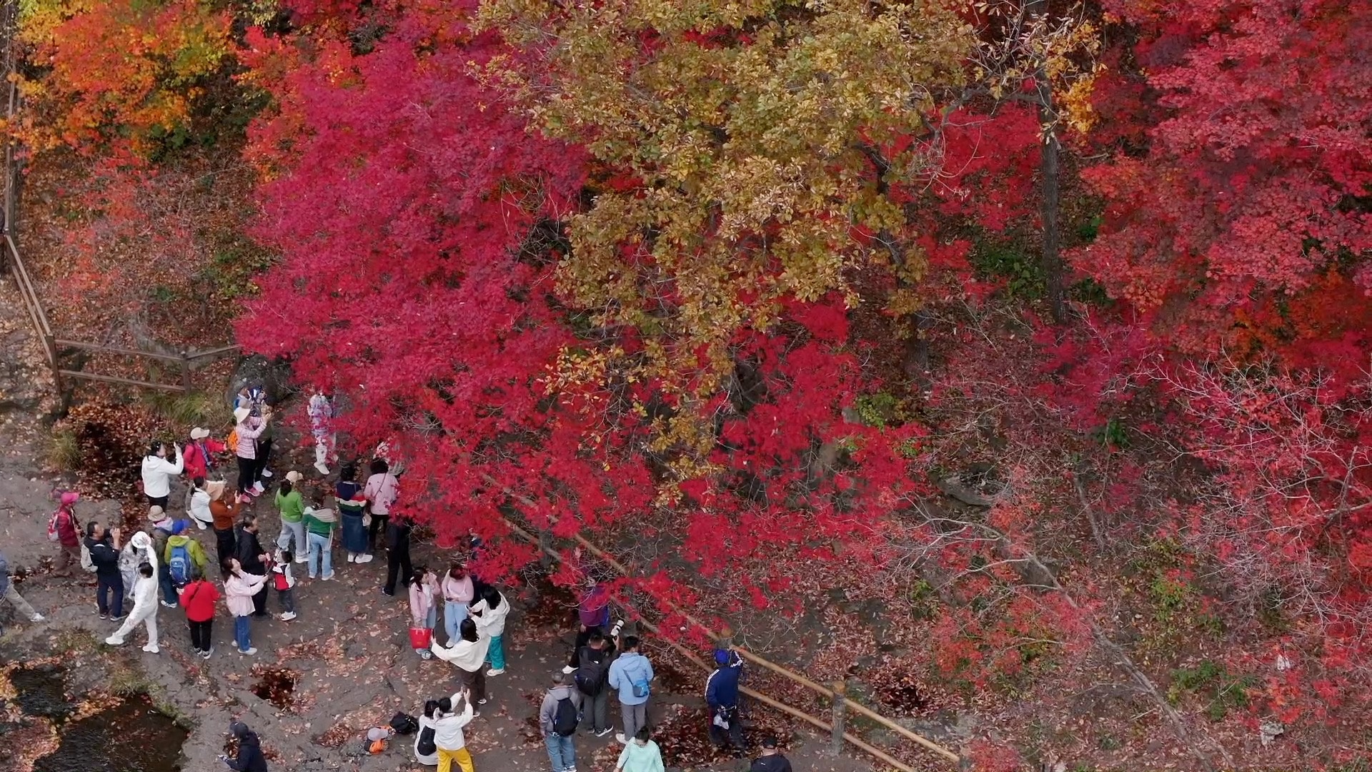 辽宁省本溪市关门山国家森林公园导游部经理孟晓倩介绍:“我们这里的枫叶主要都是槭树科的一种,颜色有黄色、橘色,还有深红、浅红、紫色……现在到了最佳枫叶观赏期,会有一种特别震撼、万山红遍、层林尽染的感觉。”