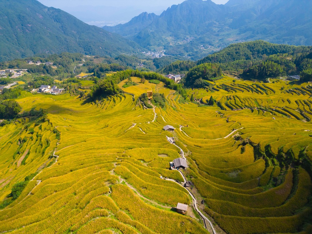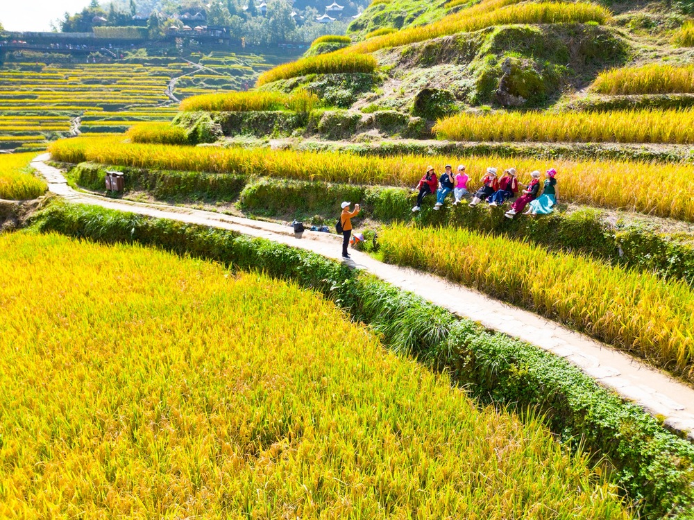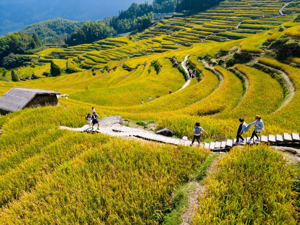 云和梯田位于浙江丽水云和县崇头镇,海拔跨度为200米至1400多米。这里四季风光各不相同,但秋季的色彩最为丰富:每年10月中旬至11月上旬是云和梯田赏秋的黄金期,此时稻谷全面泛黄,稻穗饱满垂坠——金色稻浪、云海晨雾、晒秋等场景映入眼帘。身处梯田之中,却能感受到远近、高低各不相同的层次体验。游客浦以凤赞叹道:“很开心,天气也很好,秋游就是要看黄,要有颜色,这里非常好!”