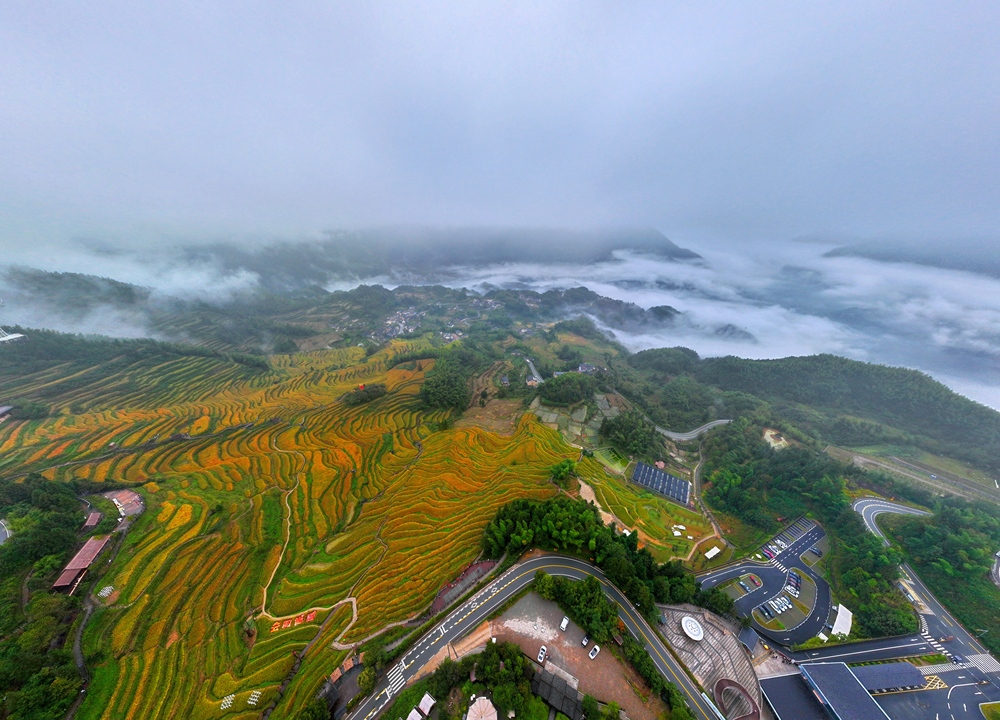 云和梯田建于唐朝初期,距今已有1000多年历史。从10月初起,每逢好天气,来这里打卡的人络绎不绝。站在观景台向下俯瞰:近处,5000多亩梯田水稻全部褪去青绿,披上金黄色的外衣,秋风吹过,稻浪翻滚;远处,梯田、山林、村庄、游人相映成趣,一幅美丽乡村新画卷徐徐展开。
