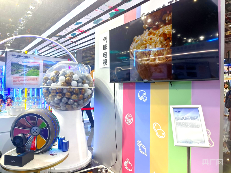 在一款名为“气味电视”的展台前,很多观展游客饶有兴致地排队体验,与普通电视不同的是,它多了一个外形与风扇类似的装置,工作人员介绍,这叫“气味打印机”。