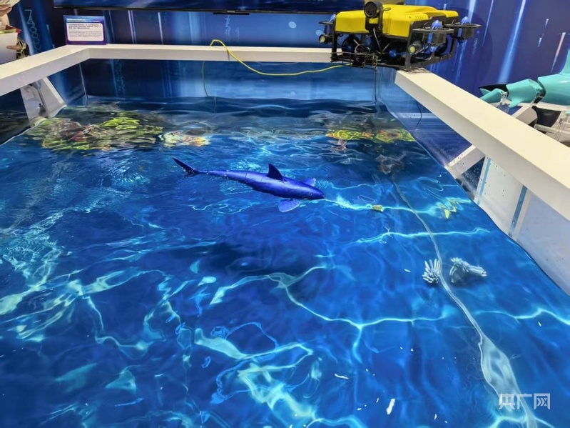 工作人员介绍:“我们主要带来了三款产品,一个是我们水下作业的机器人,叫做探海100,它可以下潜到水下100米的深度,做一些海底生物的取样,包括一些巡检工作。正在游的这条是我们一个仿生系列的小白鲨,它能下潜两米深左右,偏向应用科普教学、文旅娱乐方面。由小白鲨延伸到Plus版本,就是大白鲨。它可以下潜到水深50米的深处,做一些水下的生物观测。”