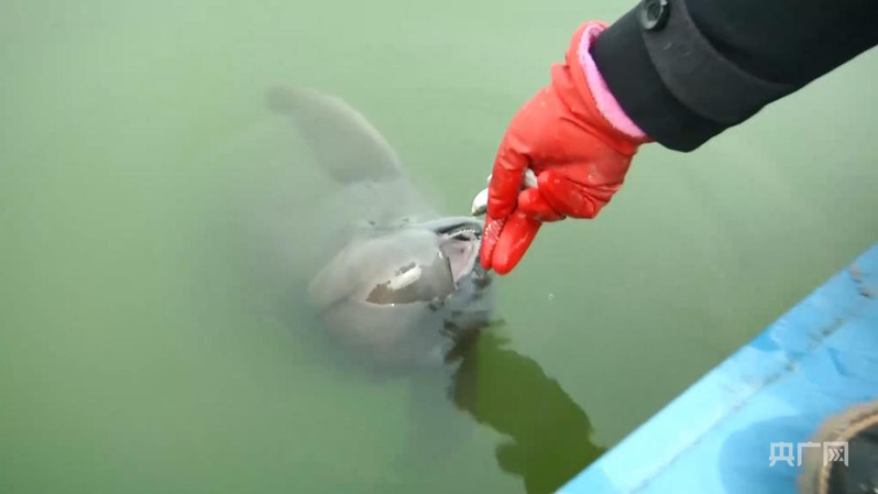 丁泽良给“微笑天使”长江江豚喂食(央广网发 湖北广播电视台湖北之声供图)
