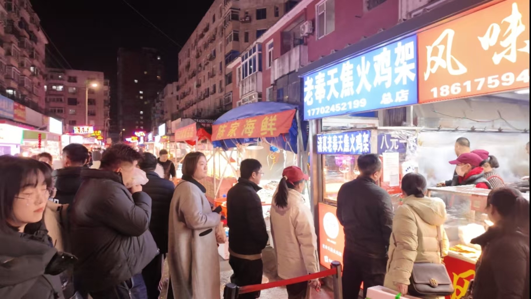 夜幕降临,初冬的沈阳飘起了片片雪花。这个烟火气十足的菜市场里,弥漫着温暖的灯光和各色小吃的香气。烤鸡架摊位前的人,用冻得通红的手捧着刚买到的美食,嘴巴一边用力嚼着,一边哈出白色的气。此刻,无论是外地游客还是沈阳本地人,大家的欢笑声在烤鸡架的渺渺烟火中融为和谐的乐曲。