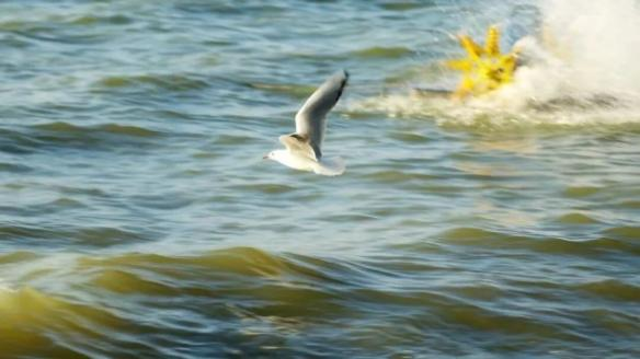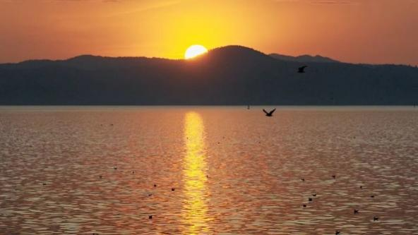 归航的红嘴鸥掠过金色湖面