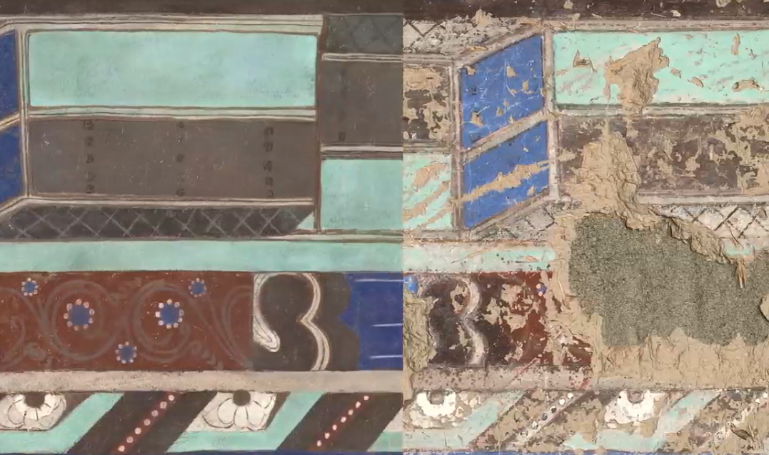 数字破解复原克孜尔古壁画效果(左)与原壁画效果对比(右)(资料视频截图)