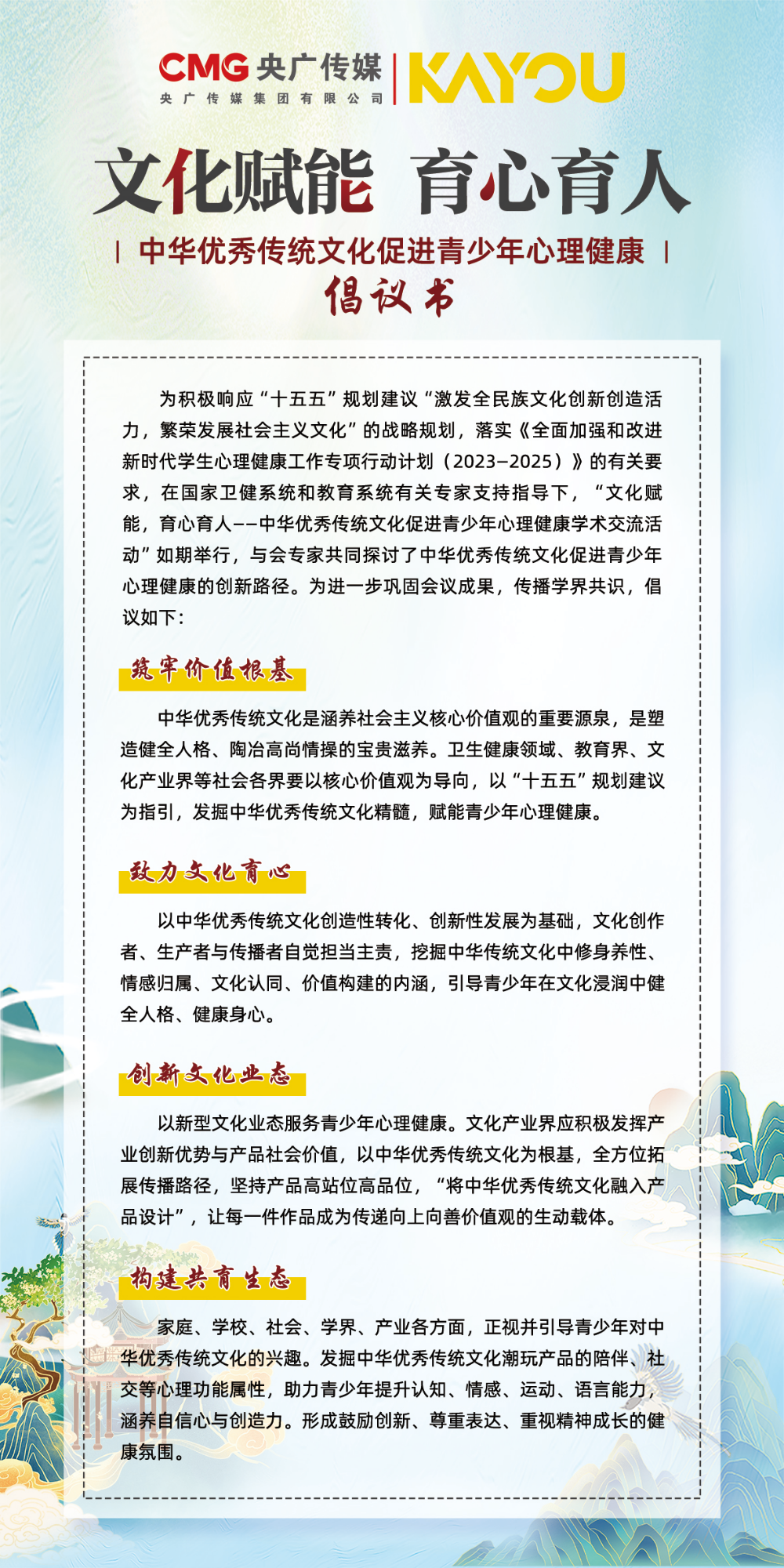图片说明:《“文化赋能,文化育人”——中华优秀文化促进青少年心理健康倡议书》在会上正式发布