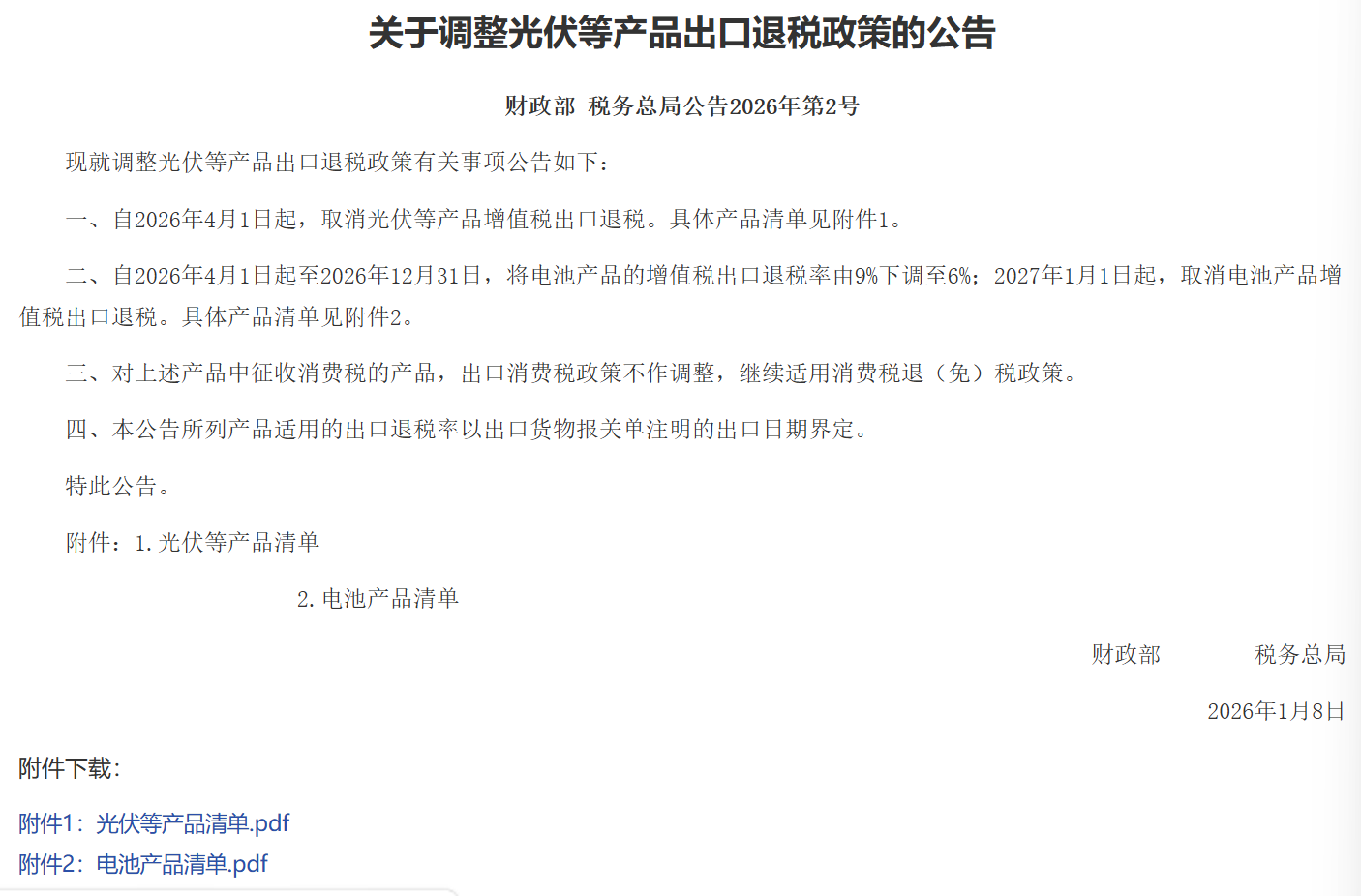 央广网北京1月9日消息(记者 宓迪)据财政部官网,财政部、税务总局披露关于调整光伏等产品出口退税政策的公告。公告称,自2026年4月1日起,取消光伏等产品增值税出口退税。自2026年4月1日起至2026年12月31日,将电池产品的增值税出口退税率由9%下调至6%;2027年1月1日起,取消电池产品增值税出口退税。