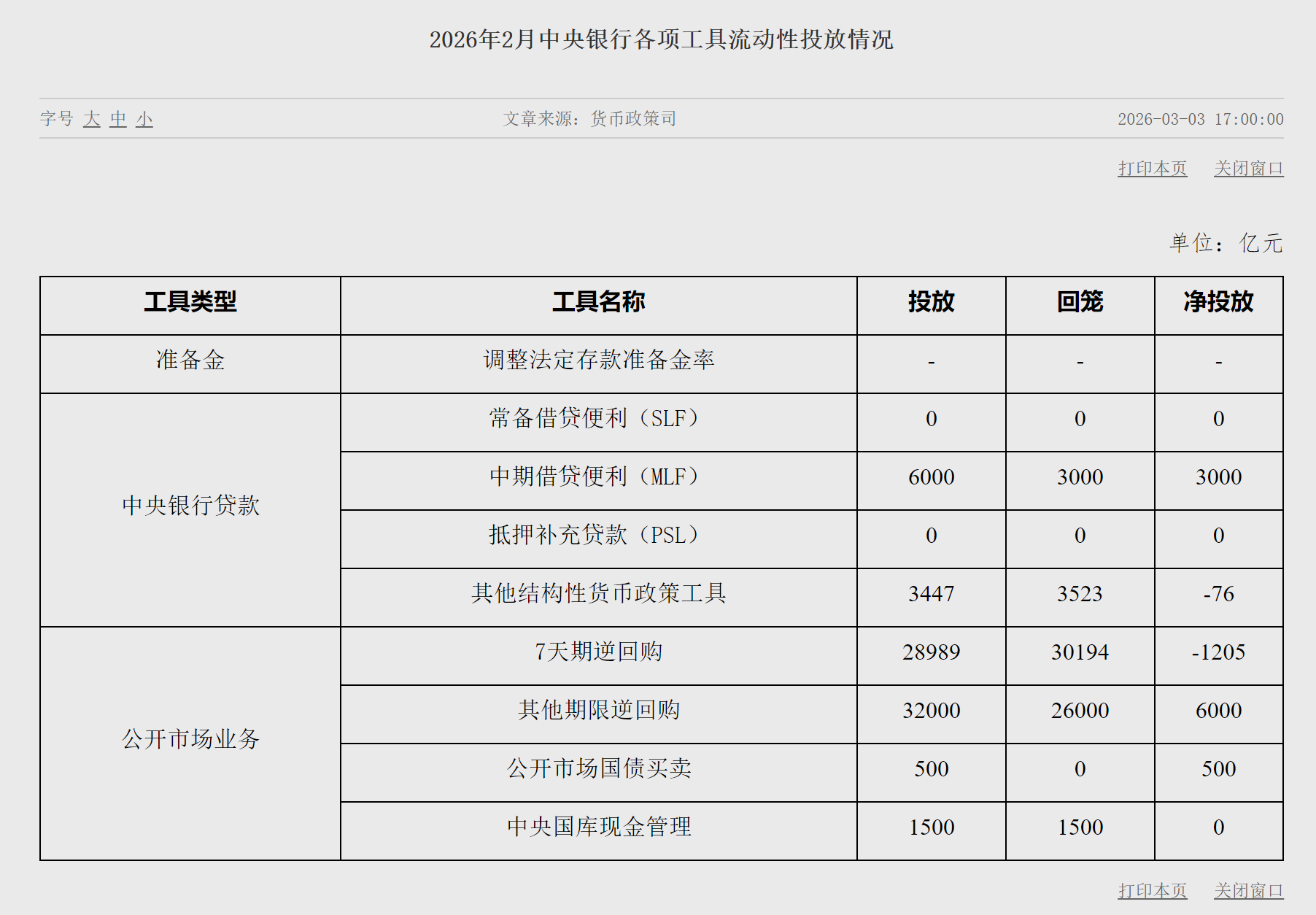 央广网北京3月3日消息(记者 冯方)3月3日,中国人民银行公布2026年2月中央银行各项工具流动性投放情况。